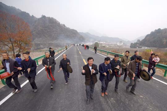 11月10日,大別山旅游扶貧快速通道水毀修復(fù)工程漁潭段改線建成通車。當(dāng)?shù)卮迕袂描尨蚬?、載歌載舞,以自己特有的方式歡慶這一時(shí)刻的到來(lái).