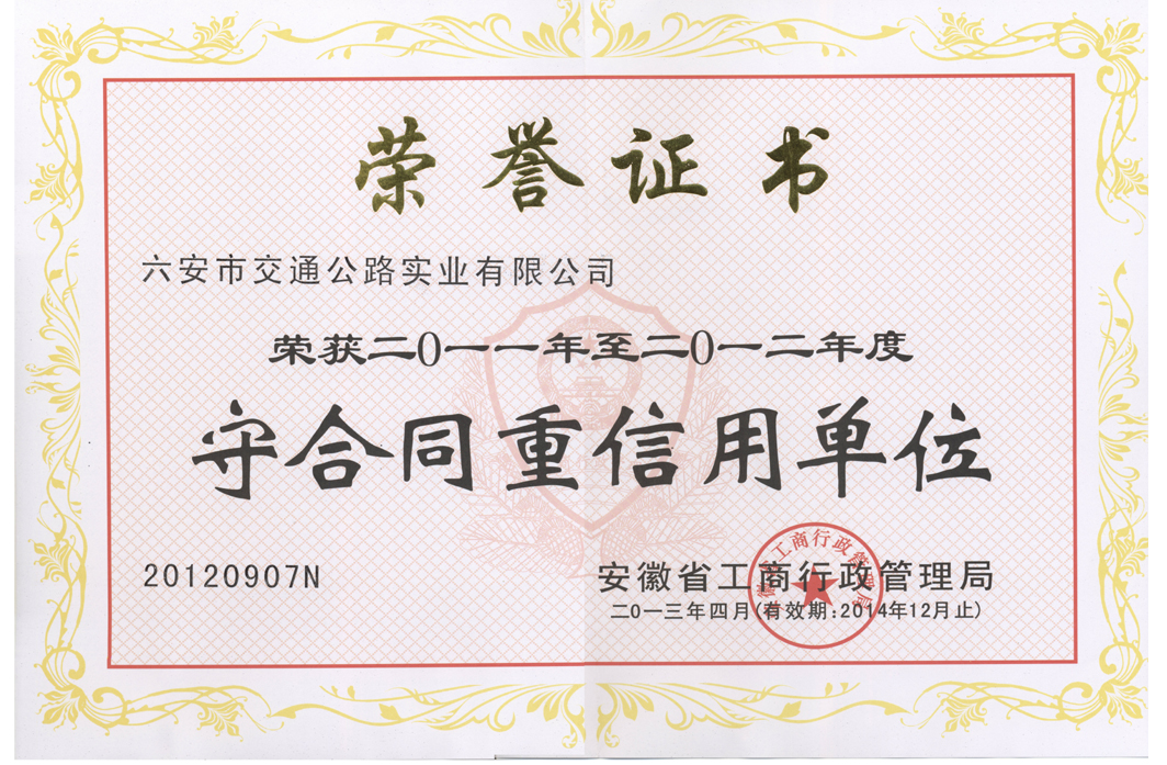 近日,六安市交通公路實業(yè)有限公司獲譽由安徽省工商行政管理局頒發(fā)的“守合同重信用”單位稱號。