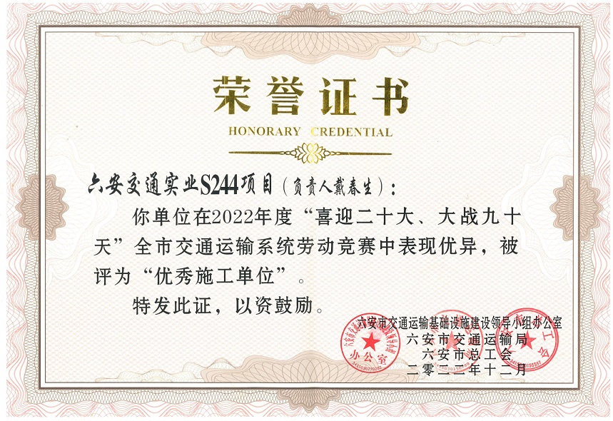 近日,公司在六安市交通運輸局和六安市總工會組織的“喜迎二十大、大戰(zhàn)九十天”全市交通運輸系統(tǒng)勞動競賽綜合考評中獲第一名。同時參與建設的S244羅崗至分路口段公路工程(二期)03合同段項目和G237六安馬頭至舒城萬佛湖工程(一期)項目在勞動競賽中被評為“優(yōu)秀施工單位”。